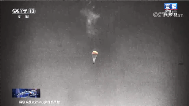 返回舱乘伞降落,距离地面6公里左右,返回舱抛防热大底。