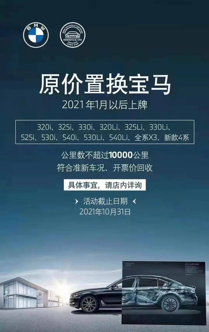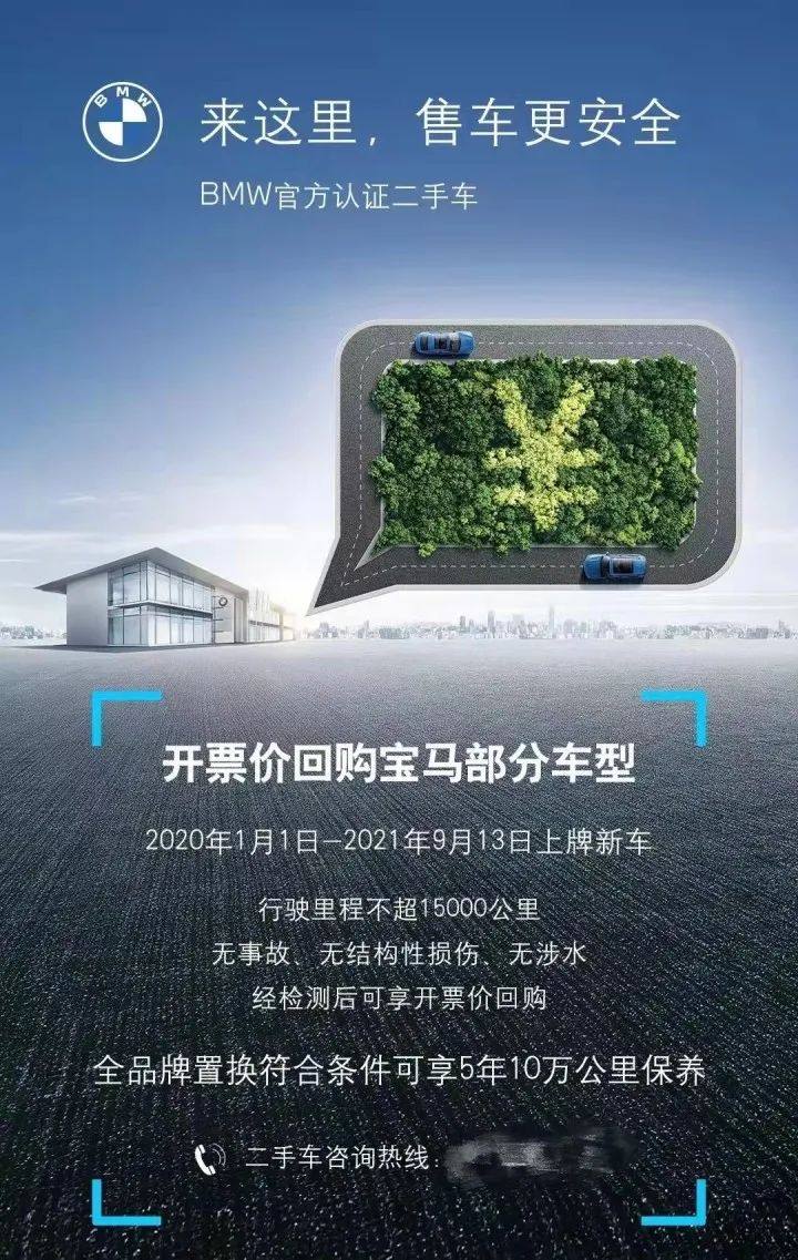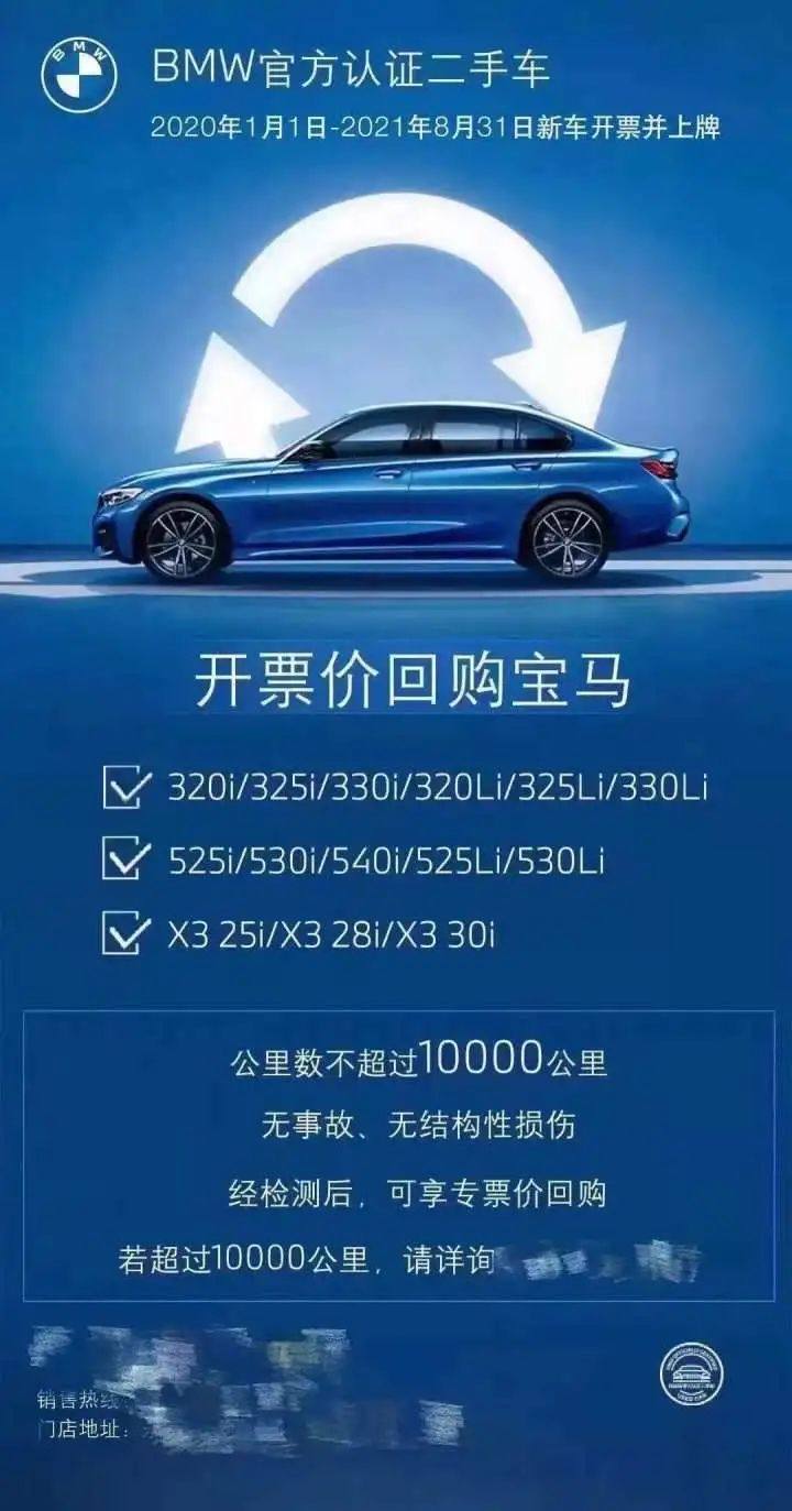 宝马4S店的回购车型更多,涉及宝马3系、宝马4系、宝马5系、宝马X3等车型,要求上牌时间是2020年1月1日之后的均可,公里数不超过1.5万公里(有的店要求1万公里),没有事故、结构损失,也没有泡过水,经检测后可以享受开票价回购的政策。