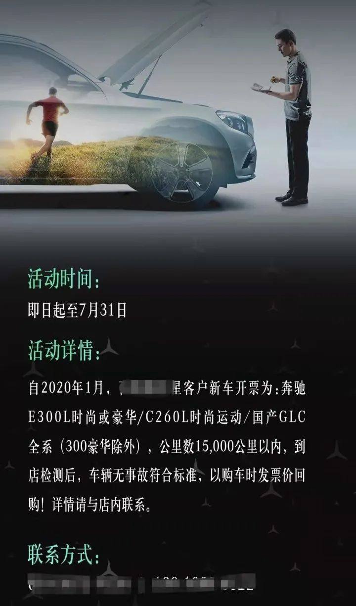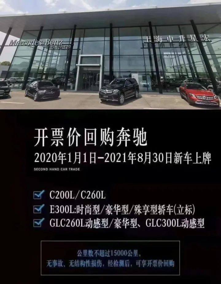 一家奔驰4S店的海报显示,对车龄大于3个月、小于15个月(以开票日期为准)的奔驰E300L时尚/豪华/殊享型轿车和奔驰GLC 260L动感/豪华型、GLC 300L动感型,可以开票价“原值回购”,并置换同品牌任意车型。对二手车的要求是,车型公里数要在2万公里以内、且无重大事故、无结构性损伤、保险理赔在2万以内。有的经销商适用范围更广,不但将奔驰C200L/C260L也包括在内,对车辆的上牌时间也放宽到2020年1月1日之后均可,不过要求车辆行驶里程要在15000公里以内。