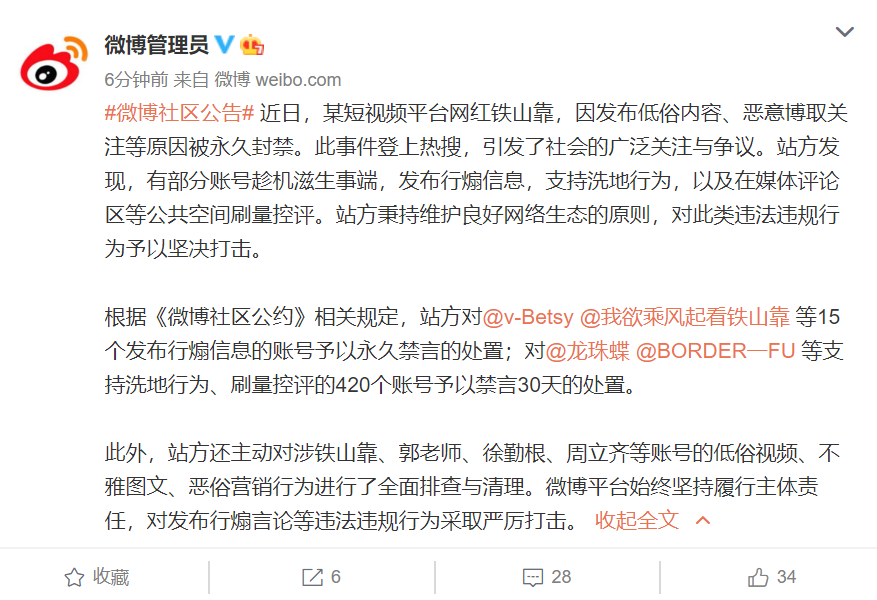 18日,@微博管理员发布社区公告:近日,某短视频平台网红铁山靠,因发布低俗内容、恶意博取关注等原因被永久封禁。此事件登上热搜,引发了社会的广泛关注与争议。站方发现,有部分账号趁机滋生事端,发布行煽信息,支持洗地行为,以及在媒体评论区等公共空间刷量控评。站方秉持维护良好网络生态的原则,对此类违法违规行为予以坚决打击。