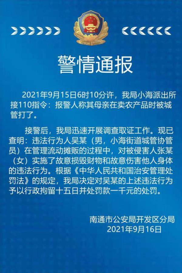 通报称,9月15日6时10分许,该局小海派出所接110指令:报警人称其母亲在卖农产品时被城管打了。