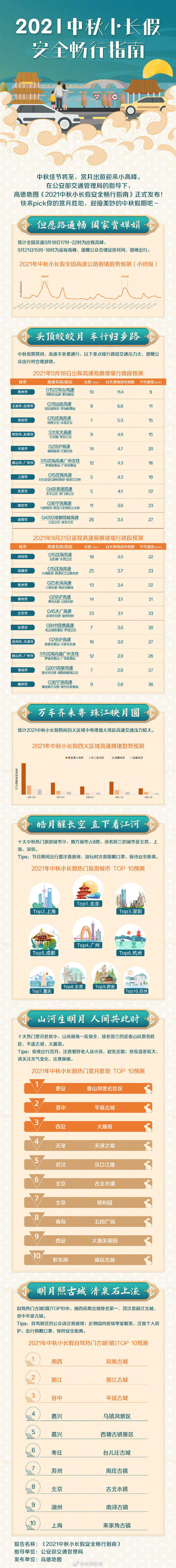 18日,公安部交通管理局指导发布《2021中秋小长假安全畅行指南》,预计9月18日15时开始,全国高速交通压力将逐渐增大,17时-22时为出程高峰。9月21日(中秋小长假第三天)15时-18时为高速返程高峰,9月22日高速路况恢复正常水平。公安部交通管理局提醒公众合理安排假期行程,错峰出行。