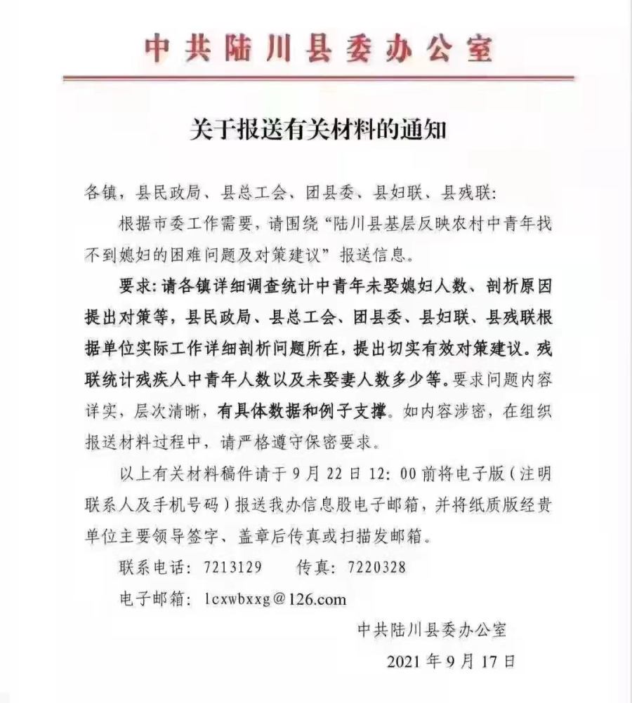 近日,网上流传一份“红头文件”:发文单位是广西玉林市陆川县委,内容是要求各镇以及县民政局等单位统计中青年未娶媳妇人数,并剖析原因,提出对策。该通知在网络上引起关注后,当地县委办公室回应称材料内容属实,是一份内部通知。不少网友在相关新闻下跟帖质疑,有人说,就算是内部通知,为啥只统计男光棍未娶,不调查女青年未嫁?有人说,不知道的还以为当地要给中青年“发媳妇”呢。还有人担心,统计未婚人员名单上报,下一步怕不是要组织上门催婚?