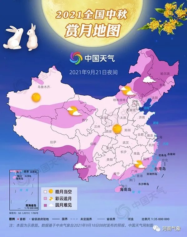 2021全国中秋赏月地图,河南雨过天晴、适宜赏月(图片来源:中国天气网)