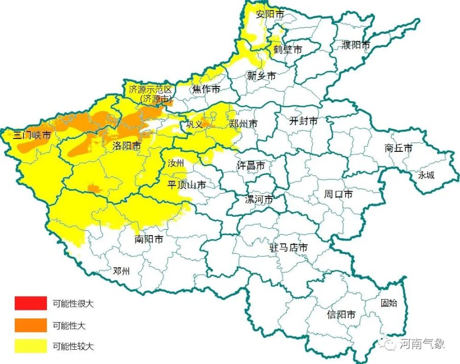 地质灾害橙色预警地区:豫西黄土地区大部、伏牛山局部, 豫中嵩箕山、豫北王屋山局部,包括洛阳西北部及南部,三门 峡北部,郑州中西部,济源东南部,焦作西部,发生崩塌、滑 坡等地质灾害的可能性大。