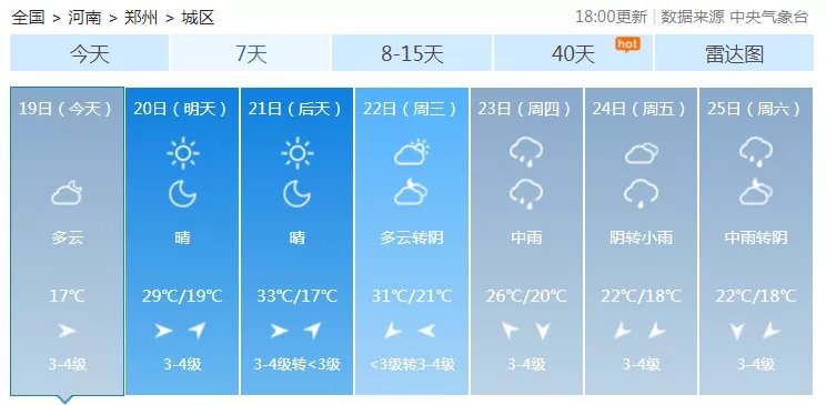 郑州19日最高气温18℃左右