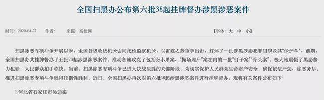 2020年4月27日,在全国扫黑办公示的第六批挂牌督办的涉黑涉恶案件中,河北省石家庄市吴迪案赫然位列第一。
