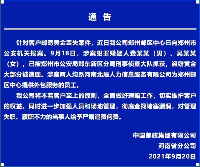 9月18日,涉案犯罪嫌疑人费某某(男)、吴某某(女),已被郑州市公安局郑东新区分局刑事侦查大队抓获,盗窃黄金大部分被追回。涉案两人均系河南北辰人力信息服务有限公司为郑州邮区中心提供外包服务的员工。我公司将本着客户至上的原则,全面做好理赔工作,切实维护客户的权益。同时进一步加强人员和场地管理,彻底查找堵塞漏洞,对管理失职、履职不力的当事人给予严肃追责问责。