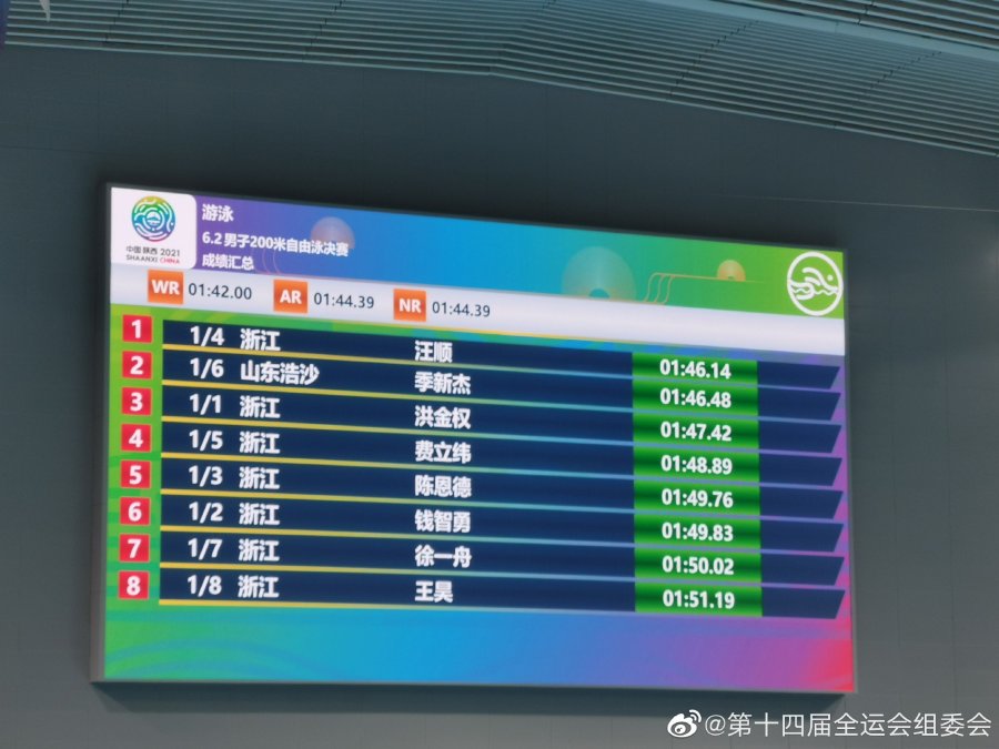 在全运会男子200米自由泳决赛的比赛中,东京奥运会冠军浙江队选手汪顺获得该项目的冠军,最终的成绩为1分46秒14,山东队运动员季新杰获得银牌,浙江队选手洪金权摘铜。