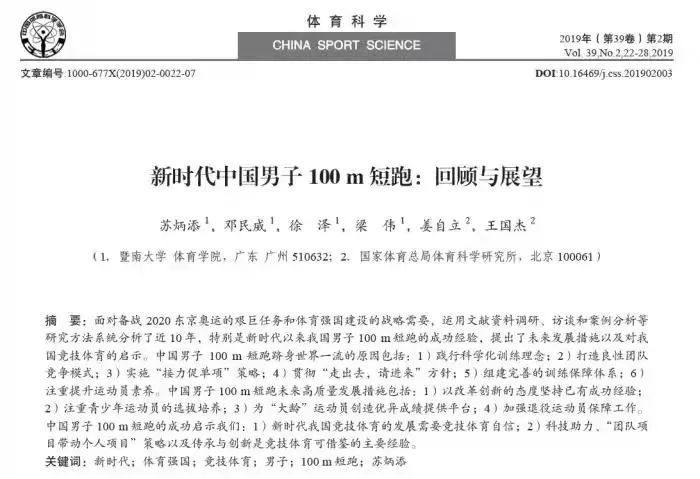 苏炳添论文:《新时代中国男子100m短跑:回顾与展望》