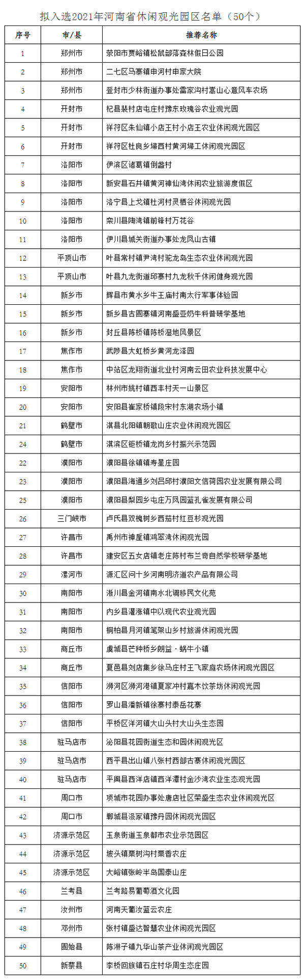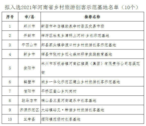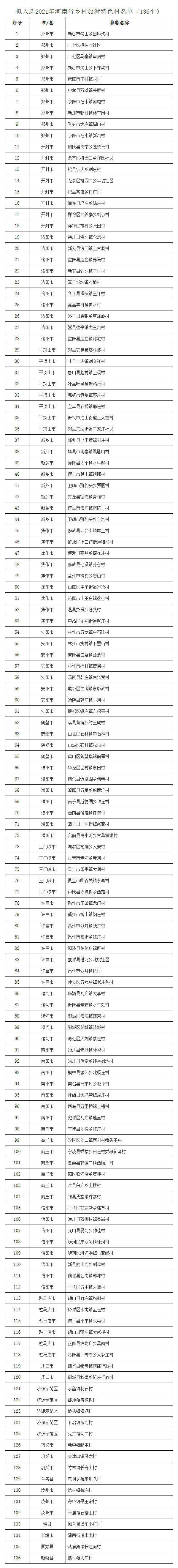 9月22日,河南省文化和旅游厅发布了《关于公示2021年河南省乡村旅游特色村、特色生态旅游示范镇、休闲观光园区和乡村旅游创客示范基地名单的公告》,公告发布了拟入选的136个河南省乡村旅游特色村、50个河南省特色生态旅游示范镇、50个河南省休闲观光园区和10个河南省乡村旅游创客示范基地名单。