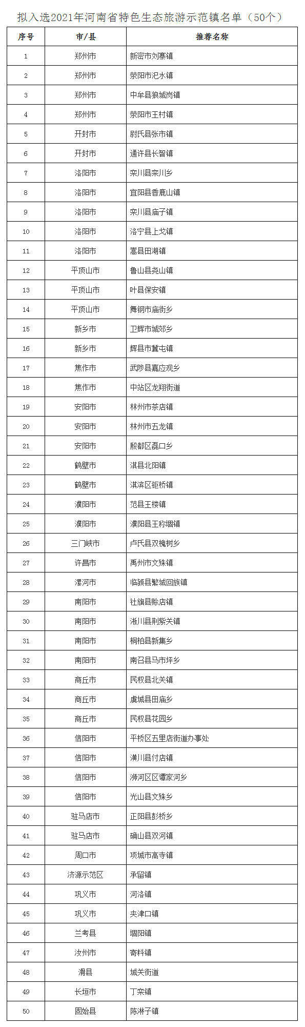 公告显示,根据《河南省文化和旅游厅关于推荐2021年河南省乡村旅游特色村、休闲观光园区、特色生态旅游示范镇和乡村旅游创客示范基地的通知》精神,省文化和旅游厅组织开展了2021年河南省乡村旅游特色村、特色生态旅游示范镇、休闲观光园区和乡村旅游创客示范基地推荐遴选工作,确定了拟入选的136个河南省乡村旅游特色村、50个河南省特色生态旅游示范镇、50个河南省休闲观光园区和10个河南省乡村旅游创客示范基地名单,现予以公示,公示期5天(自公示之日起计算)。