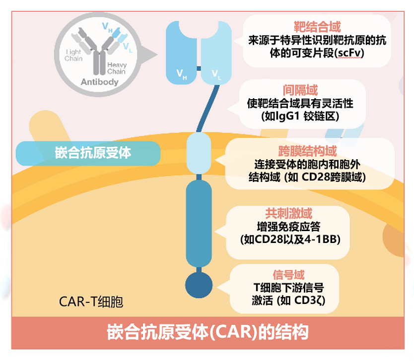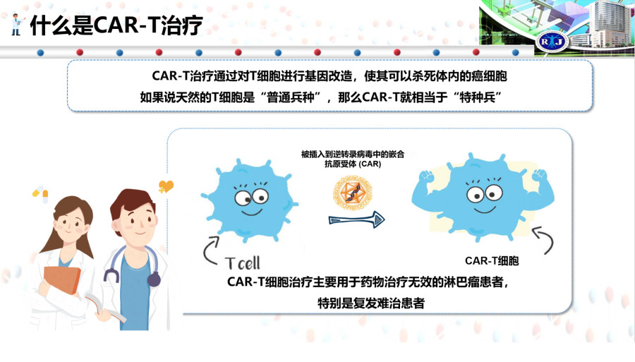 CAR-T治疗,即通过对患者的免疫细胞进行改造,导入能编码识别肿瘤特异性抗原的受体基因和帮助T细胞激活的各基因片段,形成CAR-T细胞,这些细胞既携带了识别肿瘤的“导航头”,又增强了自己杀伤肿瘤的“弹药库”,改造后的T细胞经体外扩增培养后,被回输到患者体内,一旦遇见表达对应抗原的肿瘤细胞,便会被激活并再扩增,发挥其极大的特异杀伤力,致肿瘤于死地。