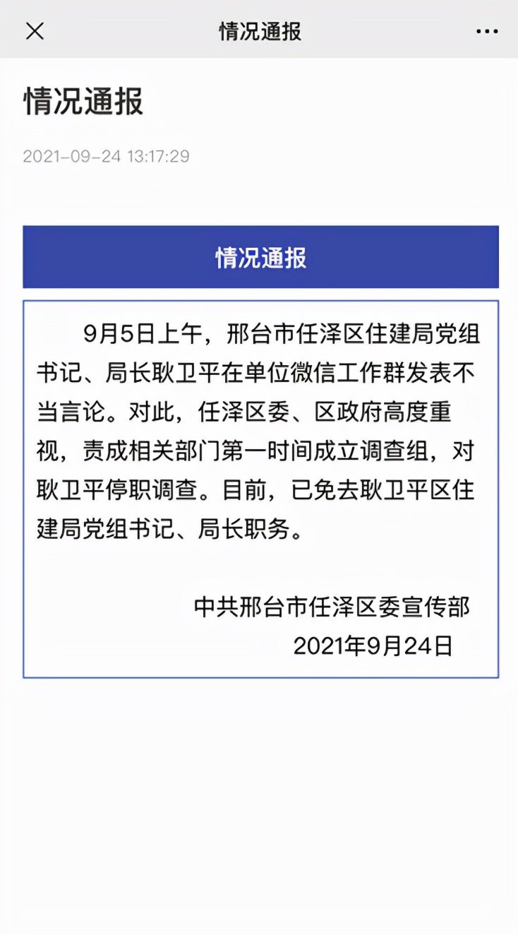 24日,邢台任泽区委宣传部发出官方通报:9月5日上午,邢台市任泽区住建局党组书记、局长耿卫平在单位微信工作群发表不当言论。对此,任泽区委、区政府高度重视,责成相关部门第一时间成立调查组,对耿卫平停职调查。目前,已免去耿卫平区住建局党组书记、局长职务。