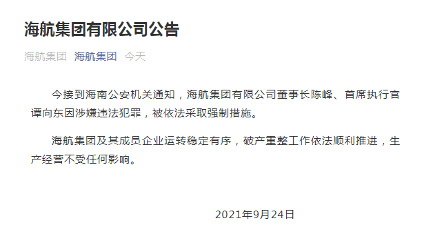9月24日,海航集团发布公告,今接到海南公安机关通知,海航集团有限公司董事长陈峰、首席执行官谭向东因涉嫌违法犯罪,被依法采取强制措施。海航集团及其成员企业运转稳定有序,破产重整工作依法顺利推进,生产经营不受任何影响。