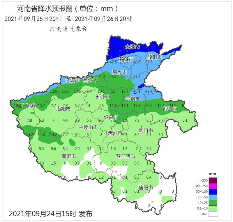 从9月24日13:00河南省雷达回波图上可以看到,强降水回波主要位于平顶山、漯河、洛阳、济源、焦作、三门峡、周口、南阳、驻马店等地。“预计未来回波缓慢东北移,影响我省大部分地区。”河南省气象台首席预报员谷秀杰当时分析说。