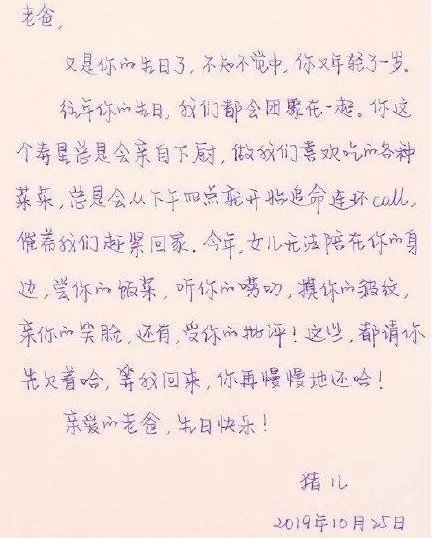 孟晚舟在朋友圈祝父亲任正非生日快乐,并表示“父爱如高山,巍峨而绵延;父爱如天空,深远而宽厚;父爱如大海,永恒而深邃(只是偶尔会咆哮)”。在朋友圈中,孟晚舟附上自己的亲笔信,称往年任正非生日都会催促家人回家,今年无法陪伴,希望等她回来再还。