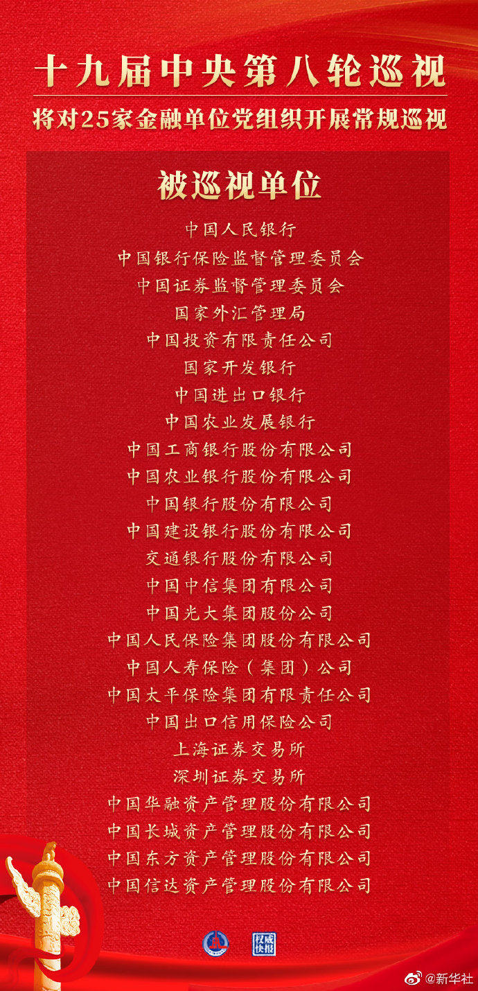 经党中央批准,十九届中央第八轮巡视将对25家金融单位党组织开展常规巡视。