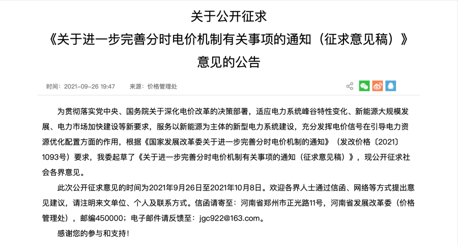 9月26日,记者从河南省发展和改革委员会官网获悉,河南省发改委发布公告对适当扩大分时电价执行范围、实施季节性电价机制、恢复尖峰电价机制等分时电价机制进行公开征求意见。