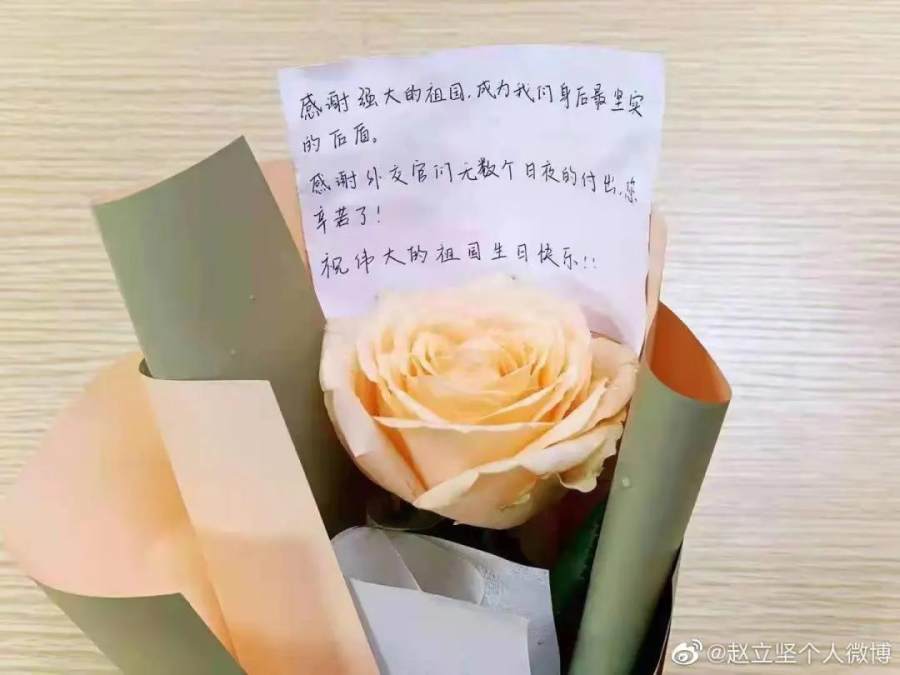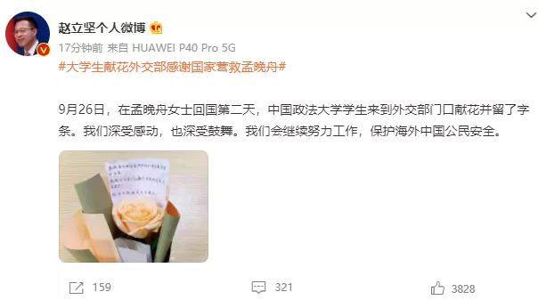 26日晚,外交部发言人赵立坚发微博称:“9月26日,在孟晚舟女士回国第二天,中国政法大学学生来到外交部门口献花并留了字条。我们深受感动,也深受鼓舞。我们会继续努力工作,保护海外中国公民安全。”