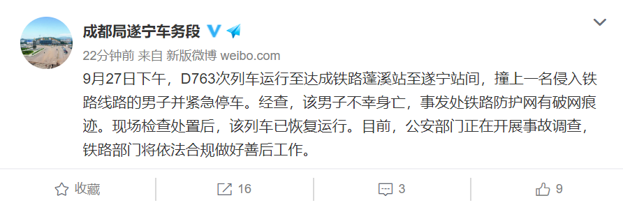 9月27日下午,D763次列车运行至达成铁路蓬溪站至遂宁站间,撞上一名侵入铁路线路的男子并紧急停车。经查,该男子不幸身亡,事发处铁路防护网有破网痕迹。现场检查处置后,该列车已恢复运行。目前,公安部门正在开展事故调查。