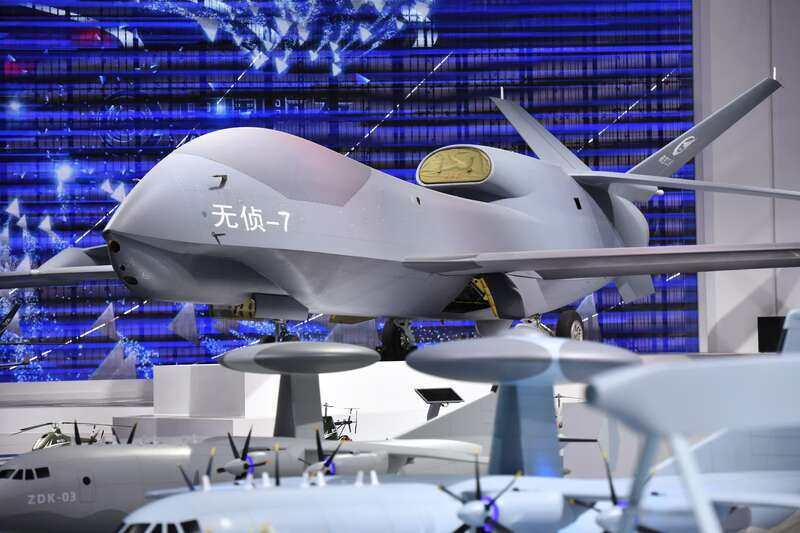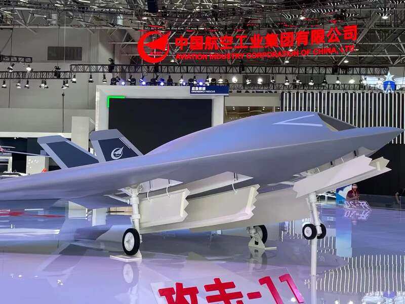 在“攻击11”上方,以吊挂形式展示了“无侦8”高空高速侦察机的模型,这也是该型无人机首次亮相中国航展。它可对敌防护严密的战略、战役目标实施有效突防,利用配装的侦察任务设备获取高分辨率目标图像,为各级作战部队提供侦察和打击效果评估情报。