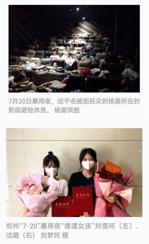 东方嘉禾影城奥斯卡花园路丹尼斯店在暴雨当夜开放所有展厅,收留近1000名市民安全过夜。“最美摆渡女孩”刘雪珂、沈璐在商场和地铁站之间涉水来来回回无数趟,找到100多名滞留不能回家的市民带至影院。
