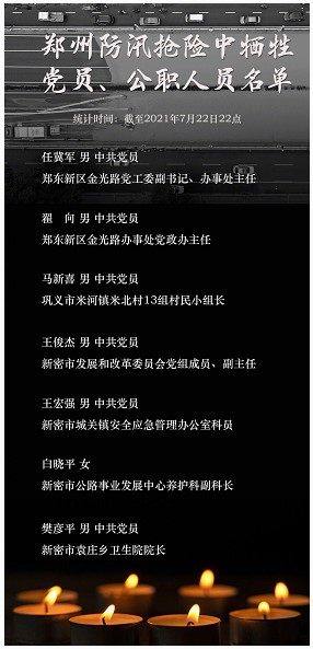 郑州市任冀军、翟向、马新喜、王俊杰、王宏强、白晓平、樊彦平、吕红均、 荣宪周、周帅锋、李大苟、彭峰12名党员干部、公职人员、企业职员在防汛救灾中履职尽责、舍生忘我、英勇牺牲。