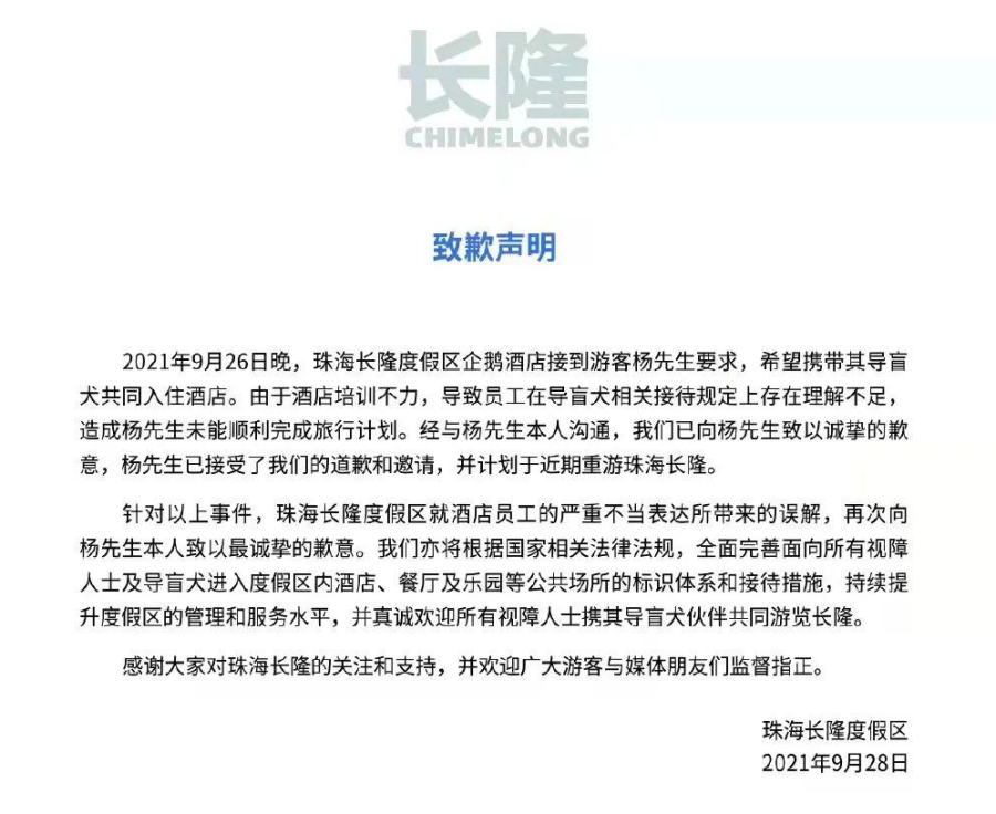 9月28日凌晨,珠海长隆度假区官微就“盲人带导盲犬入住企鹅酒店遭拒”一事发布致歉声明,称此事系酒店培训不力,导致员工在导盲犬相关接待规定上存在理解不足。此前,抖音用户“杨康盲人钢琴调律师”发布视频称,他是一名有视力障碍的盲人,带着导盲犬想入住长隆企鹅酒店时遭到拒绝。最终在警方的协调下,酒店退还全部费用,随后,他们到其他酒店入住。