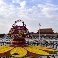 游客在天安门广场观赏“祝福祖国”主题花坛(9月27日摄)