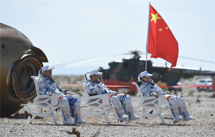 9月17日,神舟十二号载人飞船返回舱在东风着陆场成功着陆。这是航天员聂海胜(中)、刘伯明(右)、汤洪波安全顺利出舱