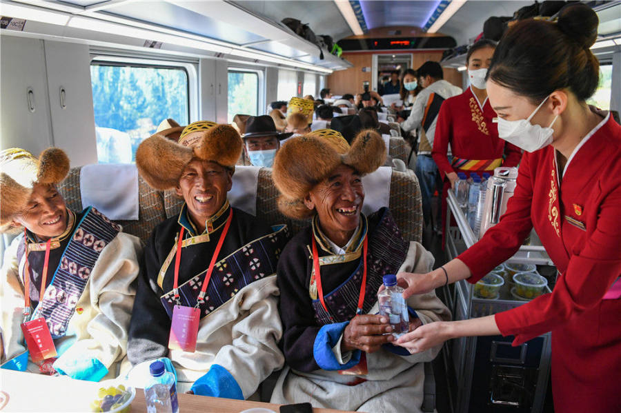 6月25日,全长435公里、设计时速160公里的拉林铁路建成通车,西藏首条电气化铁路建成,同时复兴号实现对31个省区市全覆盖。这是列车员向乘坐首趟复兴号高原内电双源动车组的乘客递水
