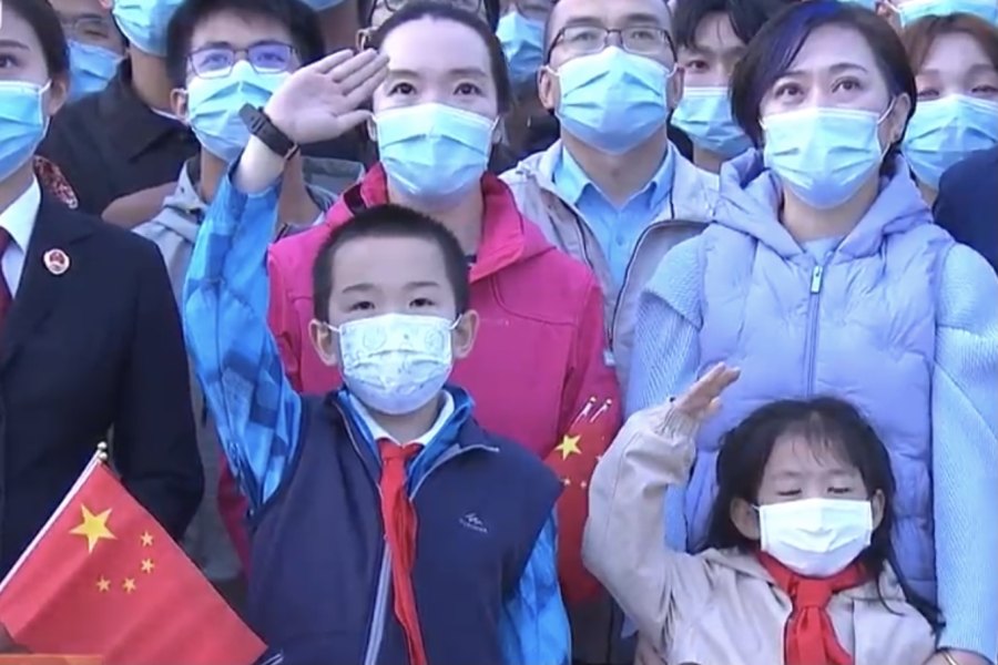 来自河南新乡、今年12岁的张云铭和爸爸妈妈站在第一排,他们戴着专门买的“我爱你中国”图案口罩。全家人昨晚10点多到的北京,第一站就直奔天安门,凌晨1点多到了天安门附近,为的就是能够占一个好位置,离国旗近些、再近些。“以前在电视上看过,这是第一次近距离感受,肯定会很壮观激动,现在一点儿都不困。”张云铭脸上难掩激动。四年级学生刘志勋和家人从大厂赶来,他说今天要多拍些升旗照片,回学校跟同学们分享。