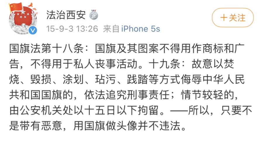 早在2015年9月3日,陕西省西安市司法局官方微博“@法治西安”就曾科普过:“只要不是带有恶意,用国旗做头像并不违法。”