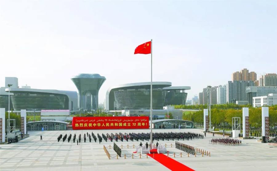 10月1日,新疆维吾尔自治区在新疆国际会展中心隆重举行升国旗仪式,热烈庆祝中华人民共和国成立72周年。