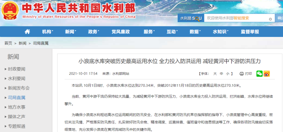 10月1日8时,小浪底水库水位达到270.34米,突破2012年11月18日的历史最高运用水位270.10米。