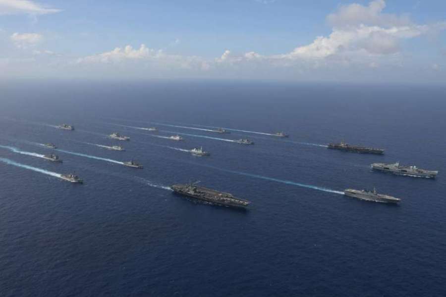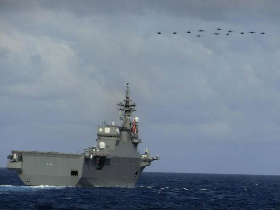 4日稍早时,日本海上自卫队在其推特上公布照片显示,有超过17艘水面各式舰艇参加本次演习,其中照片最前方并列的是英国“伊丽莎白女王”号和日本准航母“伊势”号。而在2舰略后外侧,则是美军航空母舰“卡尔·文森”号、“里根”号。在舰群后方则是3艘航母打击群的驱逐舰、护卫舰、补给船舰以及日本、澳大利亚、加拿大所加入的舰船。