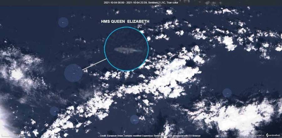 10月4日,欧空局哨兵2号遥感卫星L1C级多光谱照片拍摄到,英国皇家海军的“伊丽莎白女王”号航母战斗群(CSG-21)正通过巴士海峡驶入南海。 预计“伊丽莎白女王”号将于本轮演习结束以后,结束全球航行,返回英国本土。