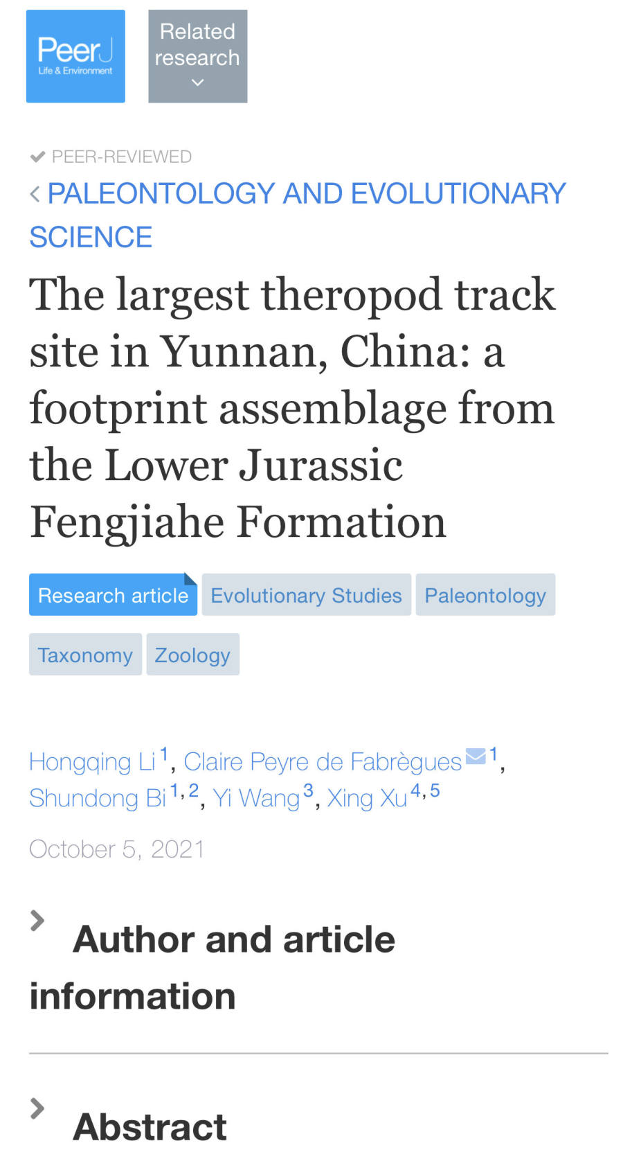 10月5日,云南大学脊椎动物研究院团队,在国际期刊《Peerj》发表了题为《下侏罗统冯家河组中一足迹组合:云南最大的兽脚类足迹点》(The largest theropod track site in Yunnan, China: a footprint assemblage from the Lower Jurassic Fengjiahe Formation)的论文,文章报道了一产自滇中下侏罗统冯家河组的兽脚类恐龙足迹点,该足迹点为目前在云南省内发现的最大的兽脚类恐龙足迹点。