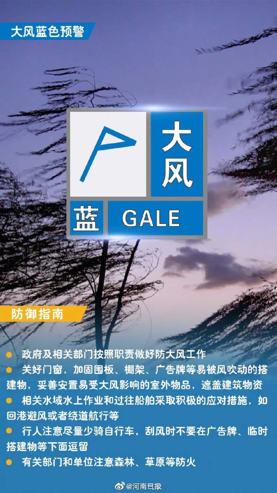 郑州市气象台2021年10月05日18时47分继续发布大风蓝色预警信号:预计未来24小时内,郑州市区、巩义、登封、荥阳、新密、新郑、中牟、航空港区将出现5级左右东北风,阵风7到8级。请注意防范。