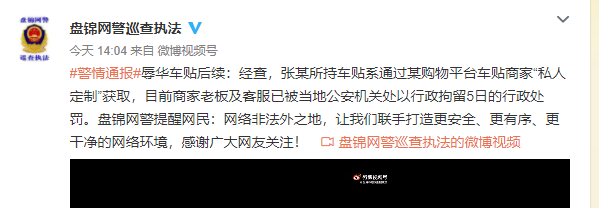 6日,据@盘锦网警巡查执法消息,盘锦市公安局网络安全保卫支队发布“辱华车贴”后续:经查,张某所持车贴系通过某购物平台车贴商家“私人定制”获取,目前商家老板及客服已被当地公安机关处以行政拘留5日的行政处罚。