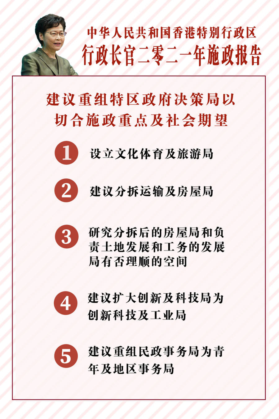 为提升管治迎接新挑战,林郑月娥就重组特区政府决策局提出建议。她建议重组可采纳以下方向:设立文化体育及旅游局,推进香港发展成为中外文化艺术交流中心;建议分拆运输及房屋局,让这两大政策范畴可获得更专注的高层领导;建议扩大创新及科技局为创新科技及工业局,改变香港“工业式微”的观感;建议重组民政事务局为青年及地区事务局,加强解决地区问题及支持青年发展。