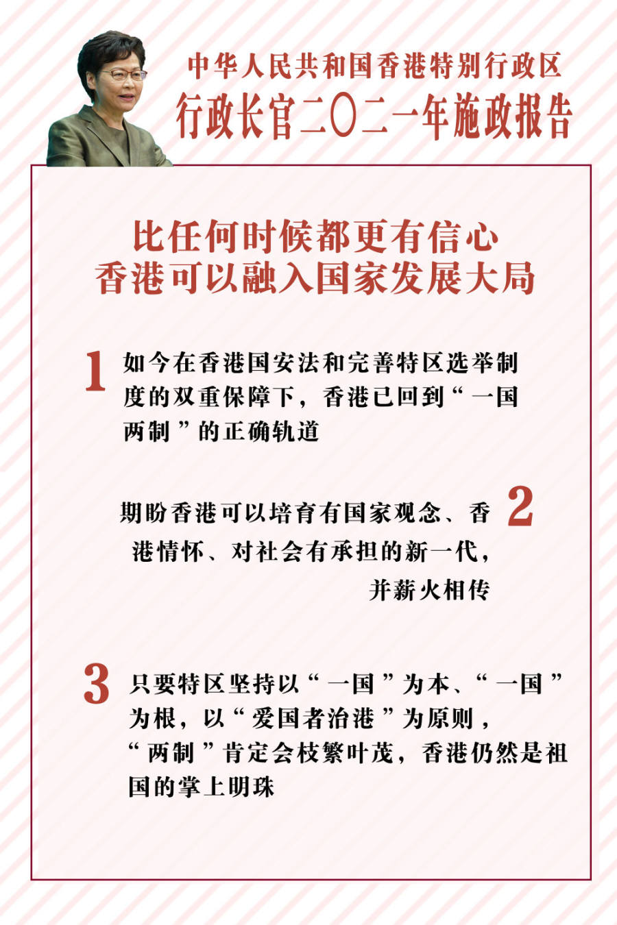 “今天,我比任何时候都对香港更有信心、更肯定香港可以融入国家发展大局,在国家迈向第二个百年奋斗目标的进程中,发挥不可替代的作用。”林郑月娥在结语中说,只要特区坚持以“一国”为本、“一国”为根,以“爱国者治港”为原则,“两制”肯定会枝繁叶茂,香港仍然是祖国的掌上明珠。