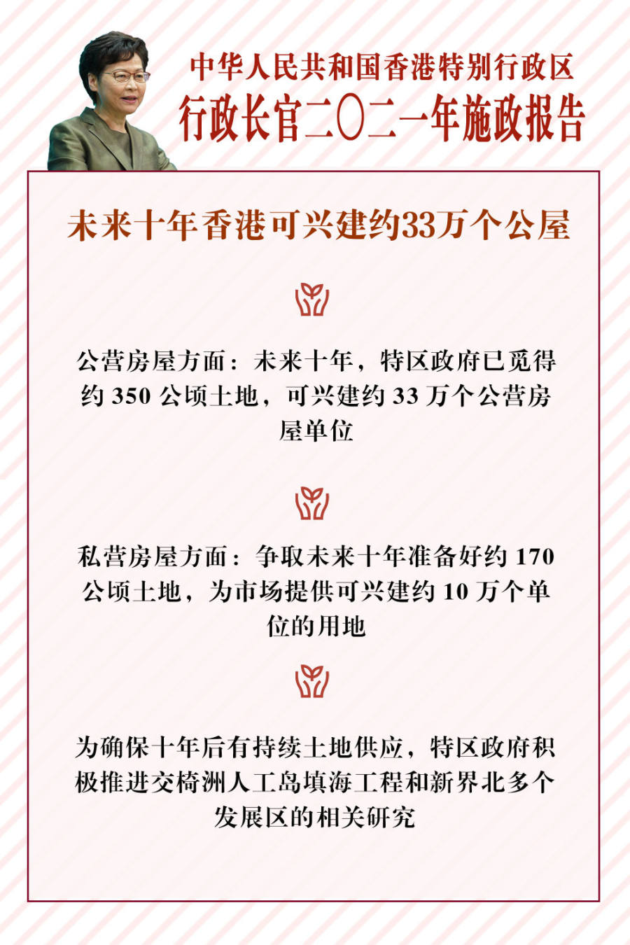 确保土地持续供应,满足市民住房需求。林郑月娥说,要实现让市民安居的目标,需要的是持之以恒供应土地的决心。她表示,已觅得约350公顷土地,可在未来十年兴建约33万个公营房屋单位,足以满足该十年期预计的约30万个公营房屋单位需求。她还说,已觅得足够土地提供原先承诺的1.5万个过渡性房屋单位。