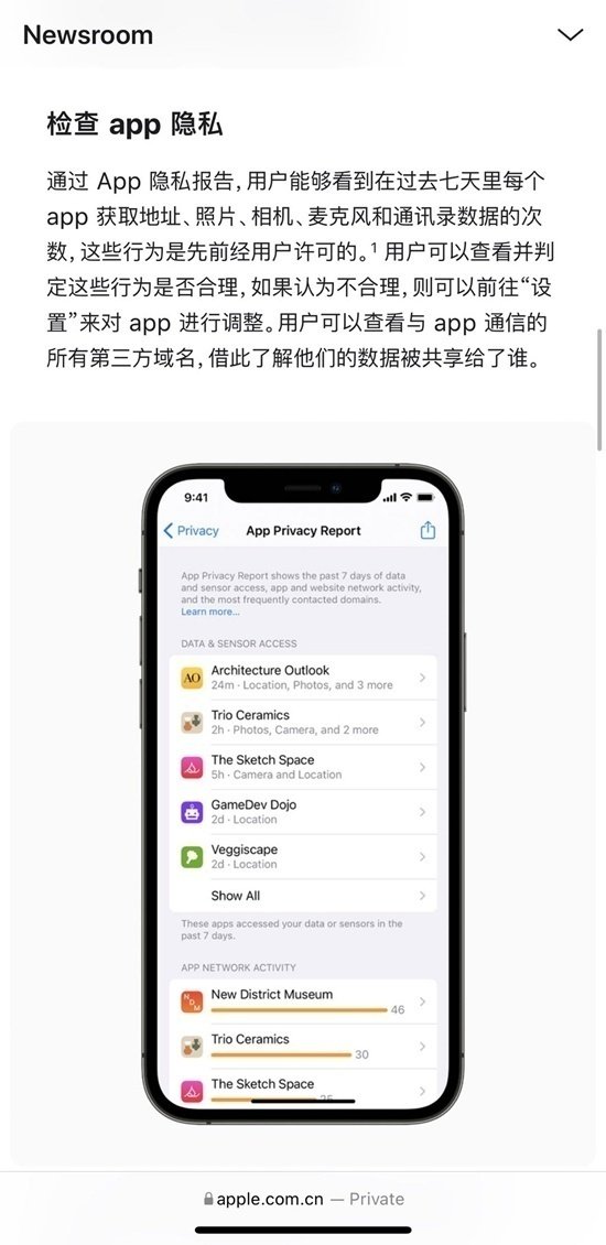 据苹果官网显示,通过APP隐私报告,用户能够看到在过去七天里每个APP获取地址、照片、相机、麦克风和通讯录数据的次数。用户还可查看与APP通信的所有第三方域名,借此了解他们的数据被共享给了谁。