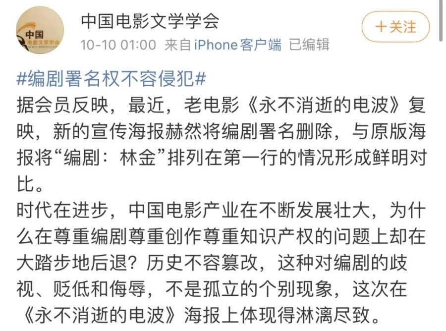 今天(10日)凌晨,中国电影文学学会维权部通过官博对此事发文,表示“编剧署名权不容侵犯” ,谴责相关方违背了《著作权法》精神,不尊重创作者的知识产权,侵害了编剧的署名权,认为此举是对编剧的歧视、贬低和侮辱。