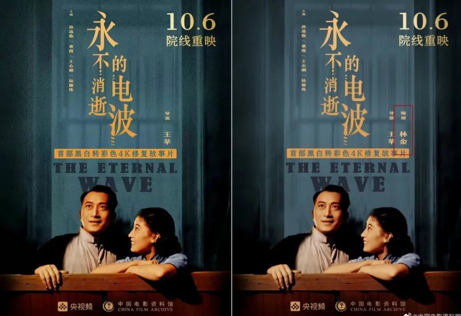 国庆期间,由央视频5G新媒体平台与中国电影资料馆联合完成的首部黑白转彩色4K修复故事片《永不消逝的电波》,在全国各地进行了50多场上映,反响热烈。但近日修复版影片的最新宣传海报因缺少“编剧林金”的署名,引起中国电影文学学会的抗议。