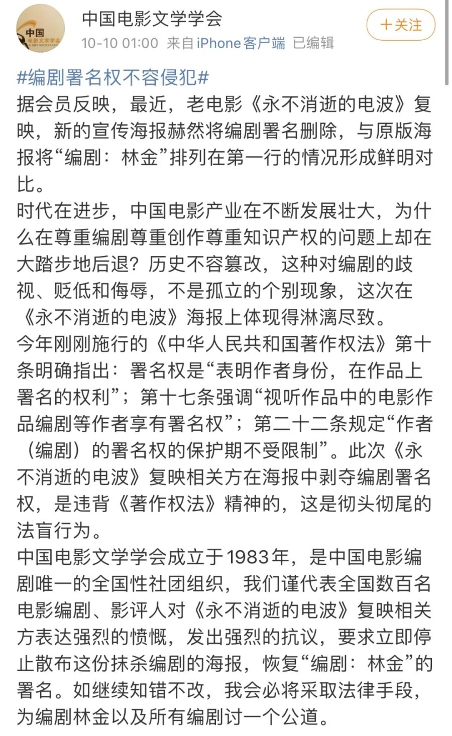 中国电影文学学会维权部要求相关方立即停止散布这份抹杀编剧的海报,恢复编剧林金在本片复映时的署名,否则将采取法律手段维权。