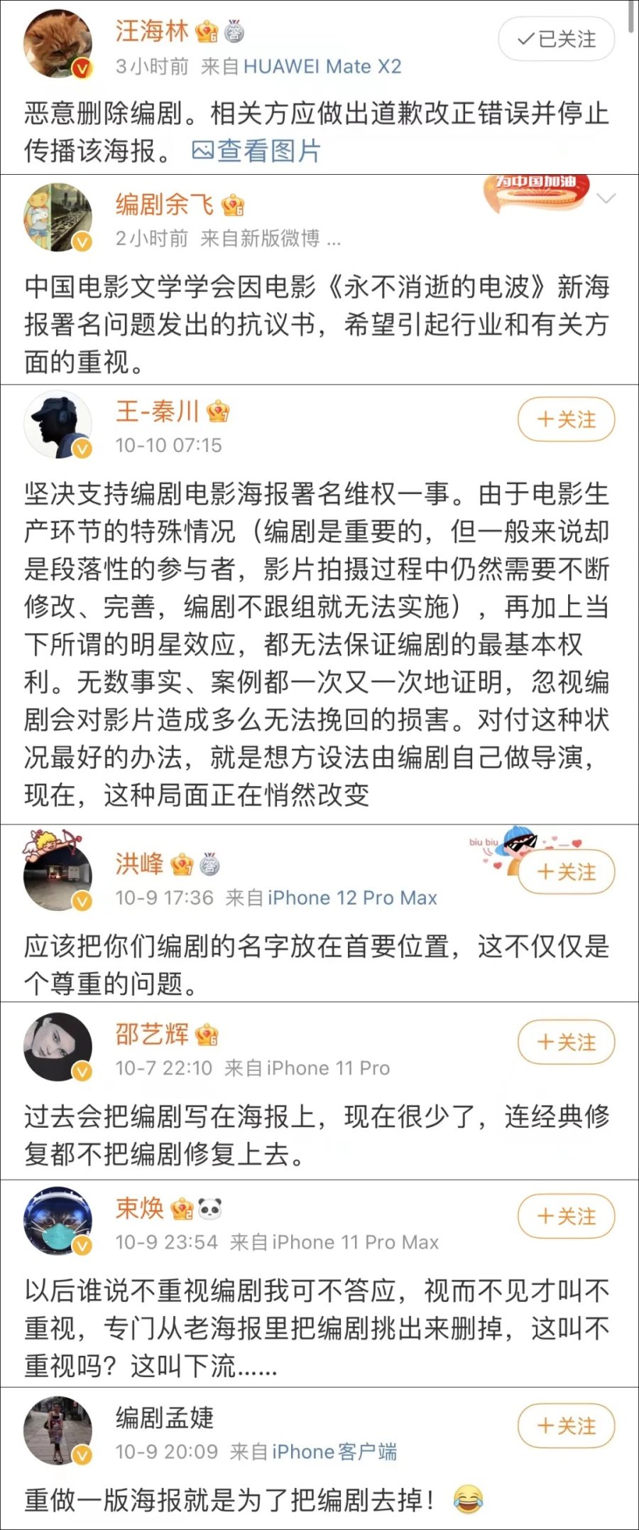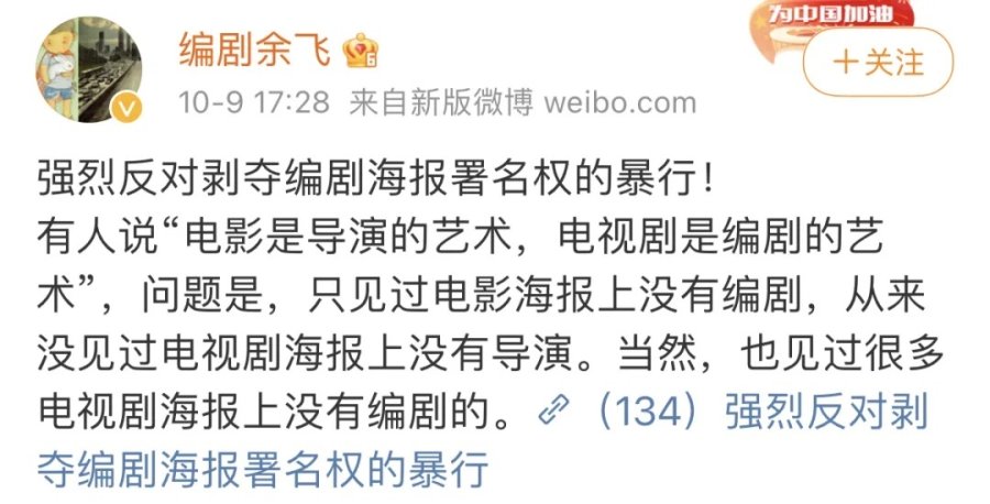 @编剧余飞 昨天(9日)还在公众号文章中表示“强烈反对剥夺编剧海报署名权的暴行”,对《永不消逝的电波》的新海报未标示编剧署名感到无法理解,“当一部电影海报上连刚红了一个月的网红年轻人都要用大号字署在上面的时候,请不要吝惜一块两三个字的空地,给那个在影视行业奋斗了几十年的老编剧署上一个名,那是他应得的。”