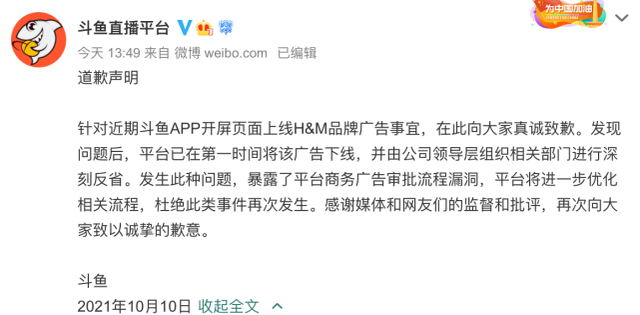 10月10日,针对近期斗鱼APP开屏页面上线H&M品牌广告事宜,斗鱼发布道歉声明。称发现问题后,平台已在第一时间将该广告下线,并由公司领导层组织相关部门进行深刻反省。“发生此种问题,暴露了平台商务广告审批流程漏洞,平台将进一步优化相关流程,杜绝此类事件再次发生。感谢媒体和网友们的监督和批评,再次向大家致以诚挚的歉意。”